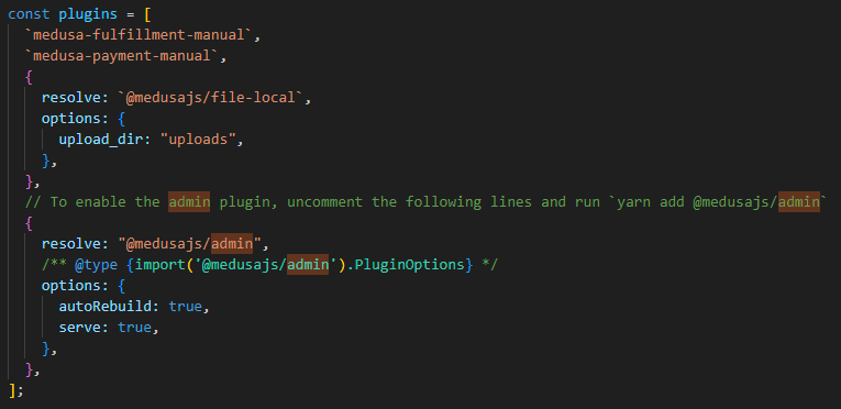 Adicione o painel de administração às configurações do Medusa Em medusa-config.js, adicione o plugin do painel de administração no array de plugins: