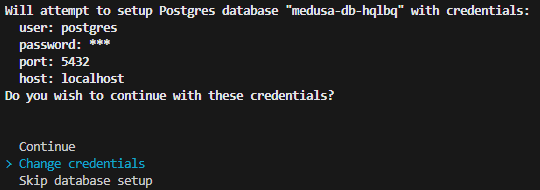Eu escolhi my-segdev-store como o nome para meu e-commerce, mas você pode escolher outro nome. Supondo que esta seja a primeira vez que você está instalando o nextjs-starter-medusa, você verá uma notificação como a seguinte: